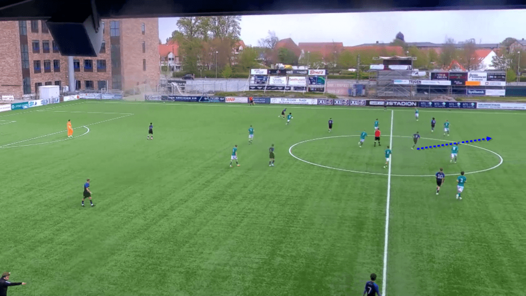 Viborg in 1-4-3-3 formation. Lasse Broberg, Viborg head coach, adopted an asymmetric solution in the build up by pushing their RB in high position and moving RW inside to create a ‘dilemma’ for the opposition LWB and to create space on the outside. LCM moving in support of the two strikers (see below).
