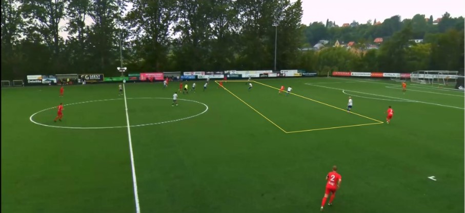 Helsingør coached by Morten Mundus Olsen in 1-4-3-3 formation had the ball for most of the match and looked to find their offensive midfielders between the lines to face the opposition defensive line with numerical advantage and create chances (see the two pictures below).
