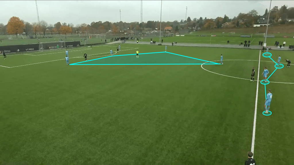 OB, coached by Ivan Poulsen in a 1-4-3-3 formation, was aggressive on the ball and gained momentum from playing more ‘vertically’ than their opponents. This helped them progressing quickly through the thirds and scoring their first two goals in the end of the first half (below we highlight the pass and the run which generated the first goal).