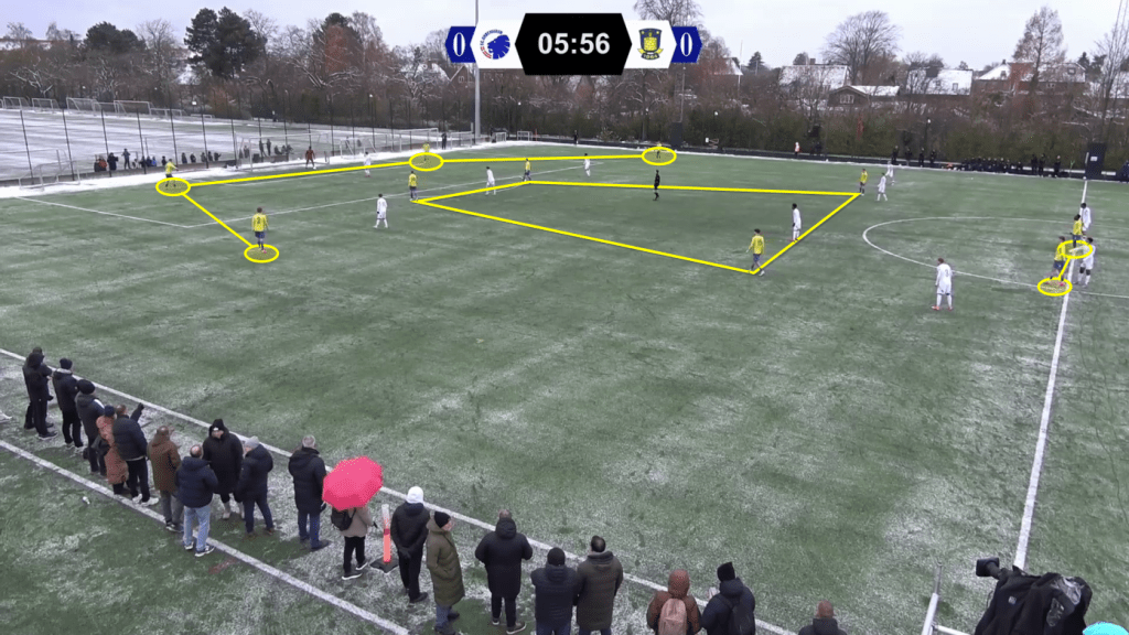 FCK coached by Morten Bisgaard in a 4-2-3-1 formation was very good in the start of the match in using the space on the outside to progress through the thirds by pushing the FBs in high position and switching the play through their offensive midfielder Oliver Højer (see image below).