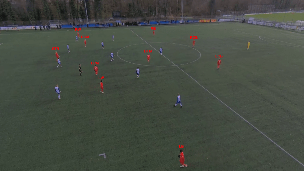 FCN coached by Anders Vang adopted an interesting solution in the build up by using an asymmetrical shape. Their left-back Noah Aagaard Okyere pushed up on the left side while their right-back Sebastian Birkegård Jørgensen took up a lower position (see image below). This allowed their right winger Tjalfe Holm Svendsen to stay wide and the opposite flank their Noah Ayorinde moved inside between the lines.