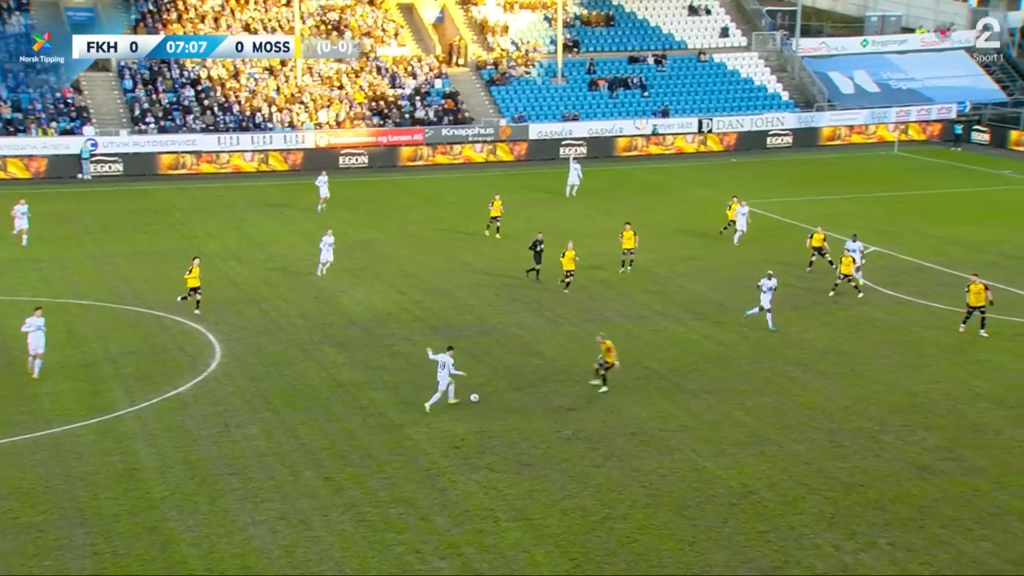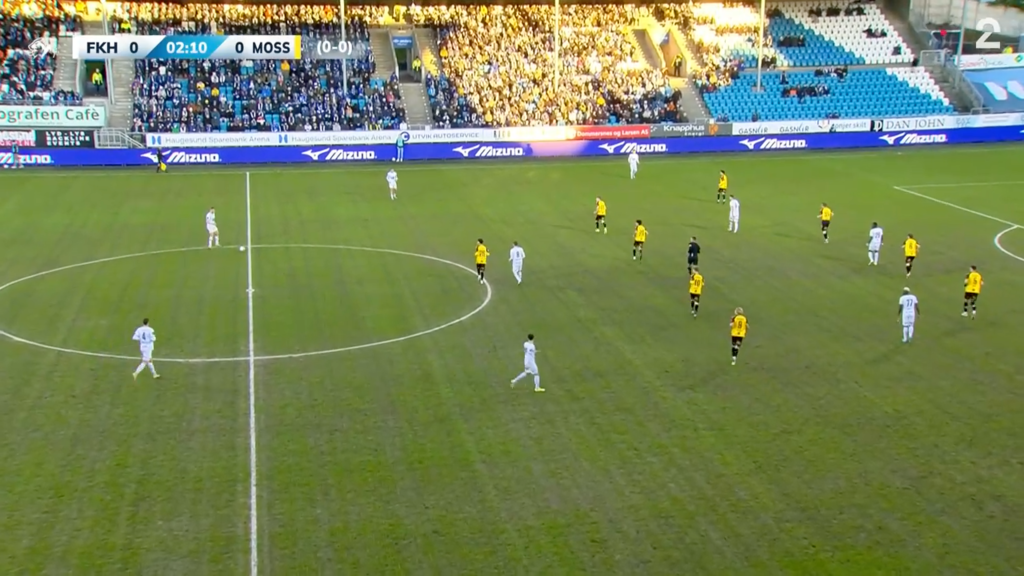 In possession, Moss transitioned to a 4-3-3 formation, focusing on controlling the midfield and building from the back. They aimed to break through Haugesund’s defence by shifting the ball across the field and attempting to create overloads on the flanks. However, despite their possession control, Moss struggled to create clear-cut chances. Haugesund’s effective build-up play ultimately punished Moss’s compact defensive structure, which had helped secured a 0-0 draw in the first leg.