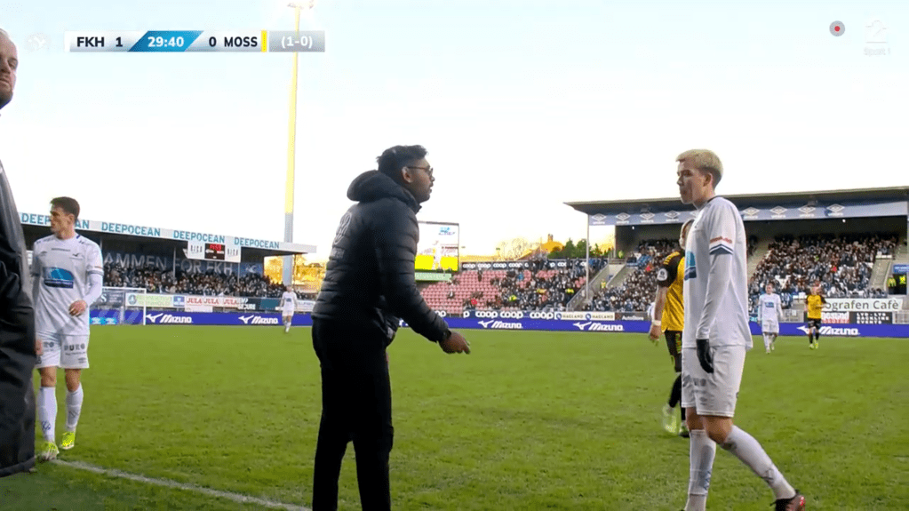 Haugesund, managed by Sancheev Manoharan, lined up in a disciplined 4-3-3 formation. In possession, their midfielders strategically operated in half-spaces to break lines and progress up the pitch. However, as the opposition set up very compact, they frequently used switches of play to exploit the width of the pitch and create opportunities into the final third. Their wingers played a crucial role, receiving the ball in wide areas, stretching the defence and providing dangerous crosses or goal scoring opportunities. Both of Haugesund’s goals came from switches of play, starting from their centre back to wide players, leading to quick attacking transitions in the final third. Defensively, Haugesund set up in a 4-4-2 formation, remaining compact and organised, limiting Moss’ space in the middle and forcing them to play wide.