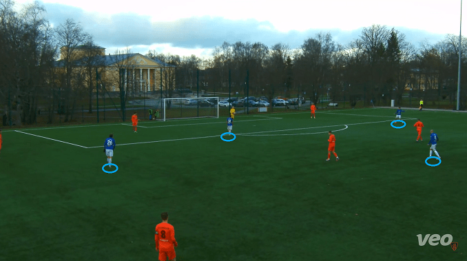 Läänemaa JK, under the guidance of long-serving coach Theimo Tülp, started the match in a shape of 4-3-3 – with two offensive full-backs/wing-backs. Despite of conceding twice in the early minutes, the team showed its character in form of a comeback, which led the 2-2 standing in the 19th minute of the play. Martin Salf, who scored the second most goals of his team so far can be highlighted as key player, both at the offense and in organizing the play. His stability and experiences were playing important roles of Läänemaa JK’s tactic. It was delighted to see how the away players tried to put the pressure onto the opposing build up play from the back (as we can see below).