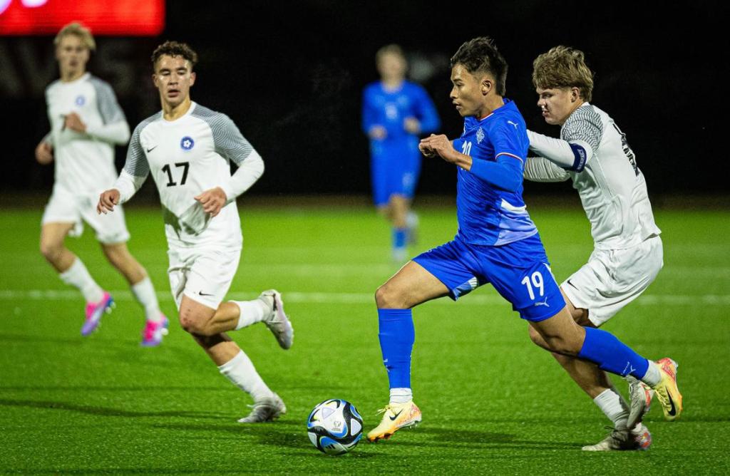 (Number 17 in white, Mohamed Amin keeps his eyes on Icelandic winger Karan Gurung in a UEFA European U17 Championship qualification clash)
