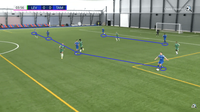 Tartu JK Tammeka, led by its young and talented coach Marti Pähn, started this clash in the shape of 4-4-2, which was often formed to a 2-4-4, when they started to build up the team’s offensive play from the back (as we can see below).