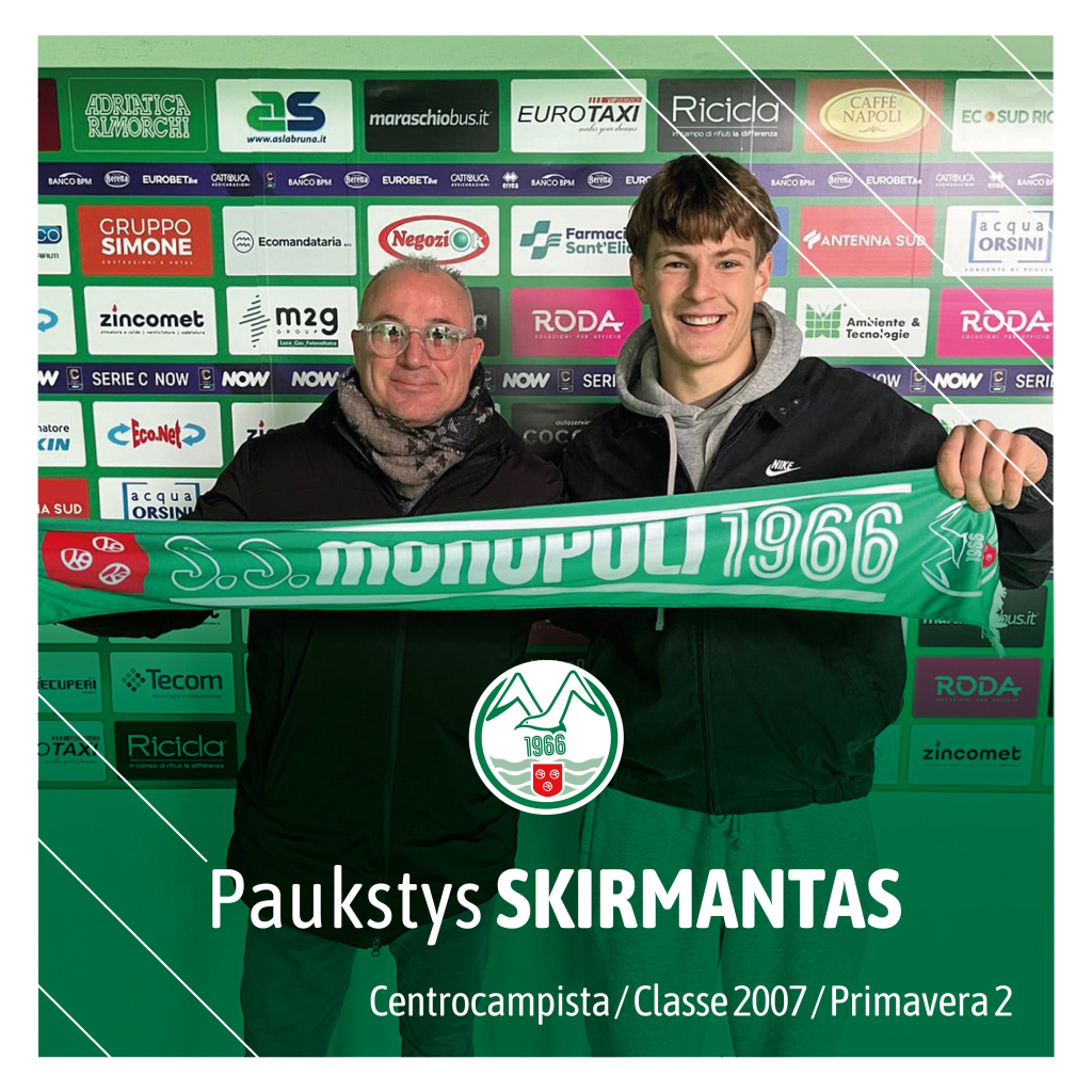 Skirmantas (born 2007) impressed positively Mister D’Ermilio (Monopoli Primavera head coach) and convinced the Club management to invest in his development. He will be already available for the ‘derby’ against Bari on Saturday in the 16th round of Primavera 2.