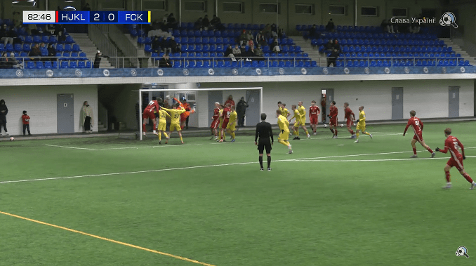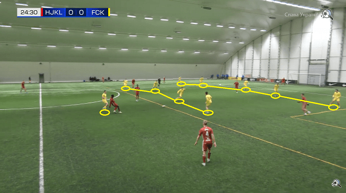 FC Kuressaare, led by Sander Post, used the opportunity to test several different shapes in this game, like 4-2-3-1 or 4-4-2 in possession, and 5-4-1 out of possession / in defending (as we can see below). Their tactical idea was similar to the opposing team idea; big emphasis was put on the quick and accurate short passes in all areas, which resulted in confident build up play and having often possession of the ball for longer periods. It was good to see Kuressaare players adaptability to the various shapes and tactics in play.