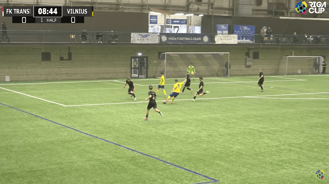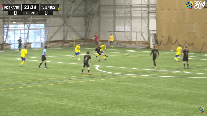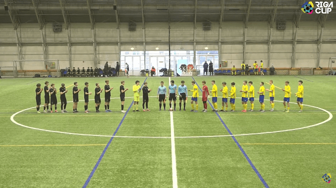 FK TransINVEST in yellow and blue, Vilnius Football Academy in full black, were playing their last group match in the U17 Riga Cup 2025 winter edition. The tournament rules were the following: all games’ duration was 2×25 minutes, with 11-11 players on the pitch – who born after 2008.01.01.