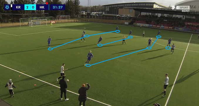 KR Reykjavík, coached by Óskar Hrafn Þorvaldsson, started its last game of the previous year in 4-4-2 (double 6) formation. Despite of it was not vital that they win, the players put the focus on to give a good result to the supporters, by performing a confident, fluid and spectacular play. They started the encounter with a heavy pressing game, with the intention to confuse the opposing defenders already in the initial phase of their build-up play.