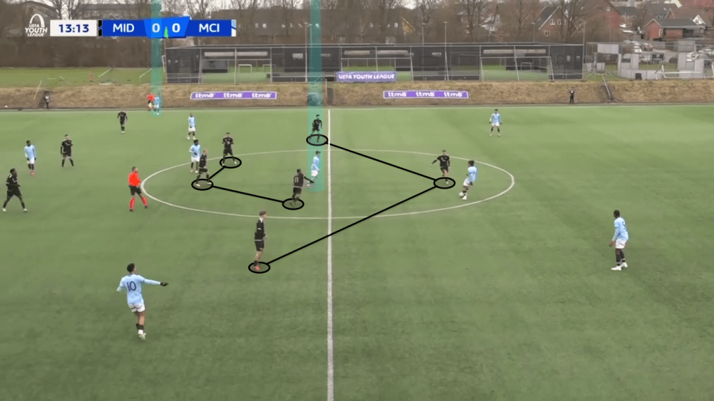 Midtjylland coached by Niclas Hougaard Hansen (previously Vejle BK U19 head coach) in a 4-3-3 formation played often long over the opposition pressure, especially in the first part of the match to avoid mistakes in the early phase of their build up. Once the match was more settled it was great to see the Danish side compete with good spells both on the ball and in their pressing game and ending the first half 1-0 after a successful pressing action.