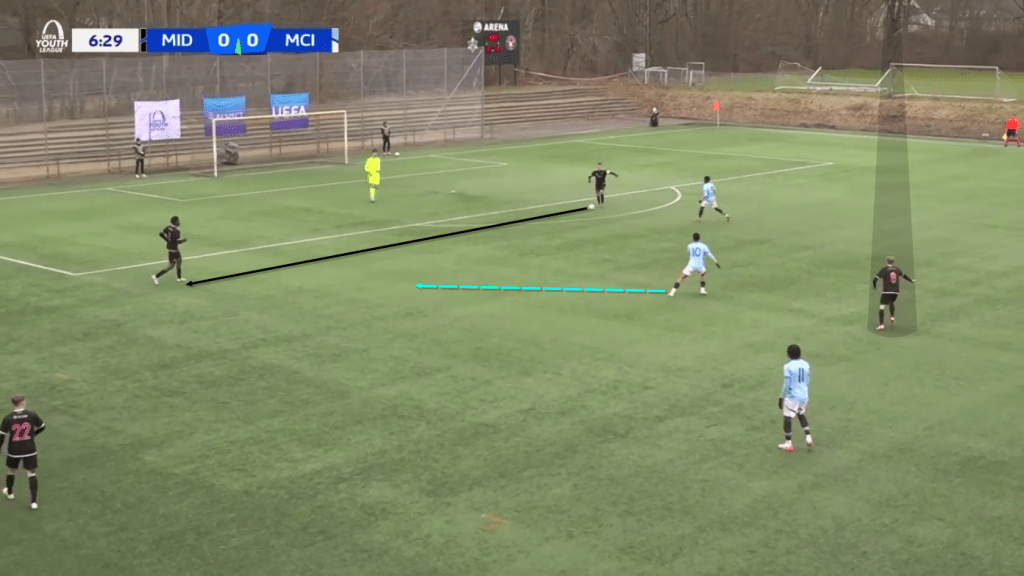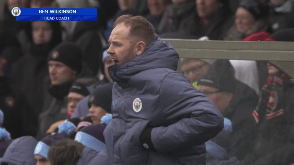 Manchester City coached by Ben Wilkinson also in a 4-3-3 formation dominated possession as by their playing style and used interchanges of position especially on their right side to disrupt the opposition defensive structure. Their first goal was of extreme quality and resembled their first team breakthrough best actions.