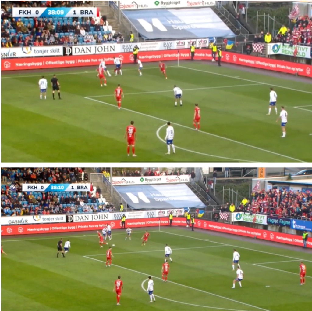 The game was similar to powerplay with Brann attacking and Haugesund defending in a deep block. Brann was a confident team in ball playing and it was mainly due to the 3 brilliant ball players in the middle. At occasion they were playing on few touches, confidently in tight spaces and even the occasional heel and toe in Brazilian fashion.