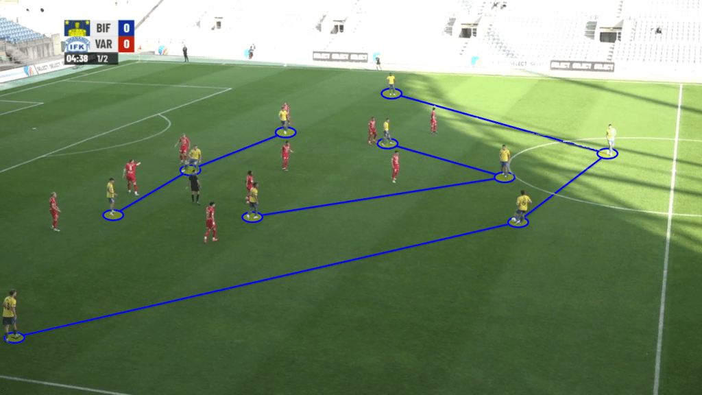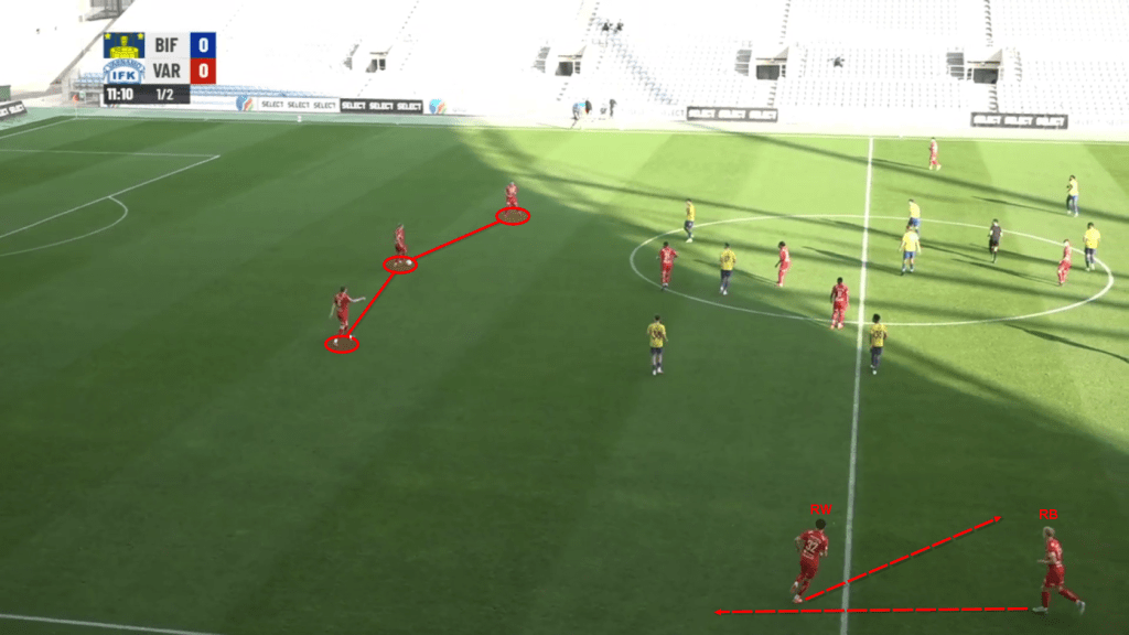 Another effective solution adopted by Varnamo was to build up with 3 by pushing their RB up and by narrowing their LB. This together with well coordinated interchanges on their right side gave them success in breaking through the opposition pressure and defensive line (see image below to relate to it).