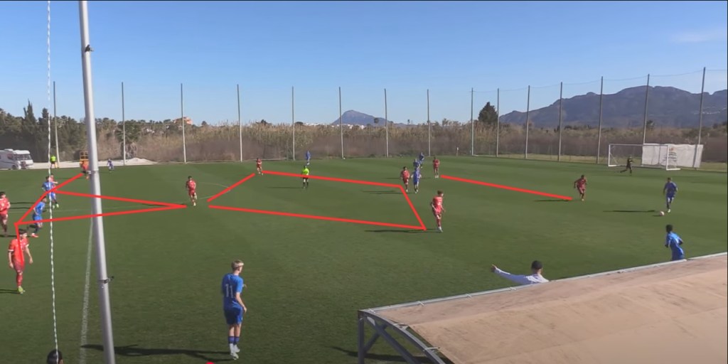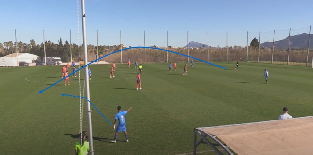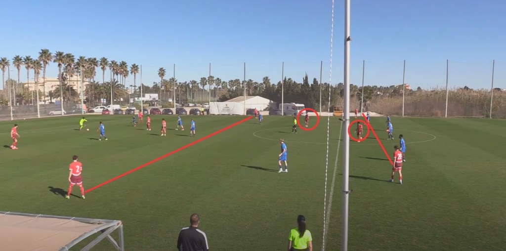 Finland U17, coached by Erkka Lehtola, had a shape of 4-4-2 in defense and 4-2-3-1 in attack. At times, the Finnish left-back positioned himself in an inside position and the left winger maintained width by positioning out wide. The team found joy in the middle third, where players on the outside of the Swiss’ narrow 4-4-2 mid-block found space to maintain possession and progress. Increasingly successful long balls from goalkeeper Max Kulmala allowed the Finnish left-back to progress on the wing, or the Swiss’ right back pressed him which in turn allowed the Finnish left winger to exploit the channels.