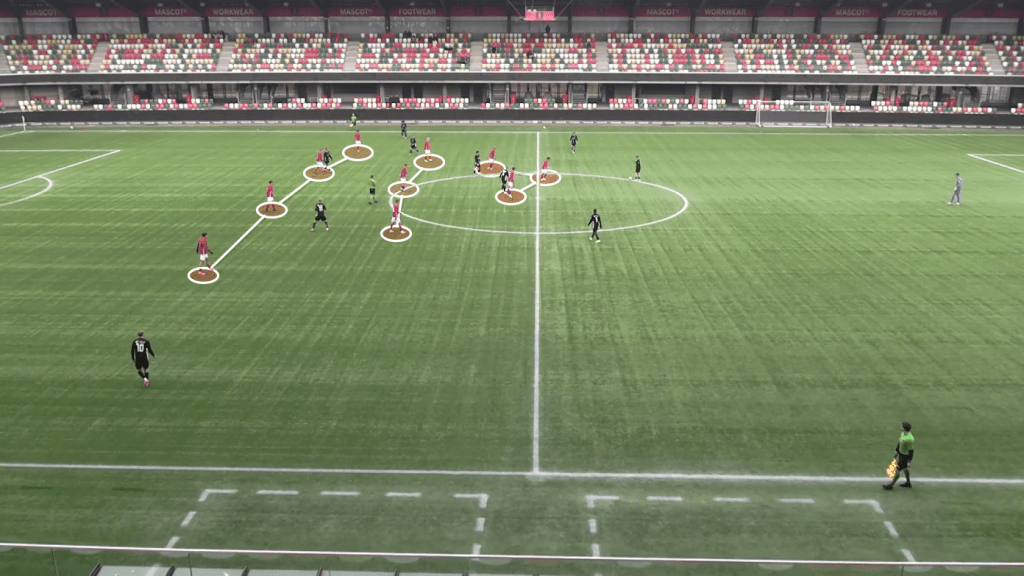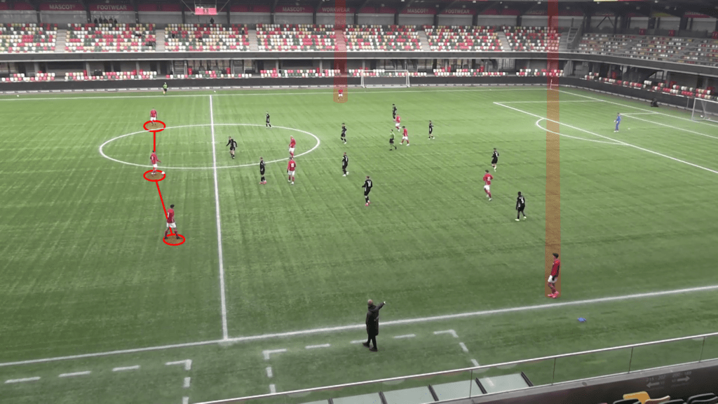 FC Nordsjælland coached by Sune Jensen in a 3-4-3 formation dominated the ball possession in the first half of the match but could not break through the opposition defensive organization to create significant chances. One of the main tools used to get behind the opposition back four was to play early balls both from their defenders and their central midfielders. The main ‘runners’ were the right wing-back Jonathan Krath and the striker Markus Seim-Monsen (who sprints between the two central defenders in the image below).