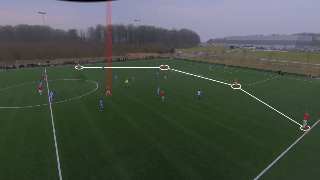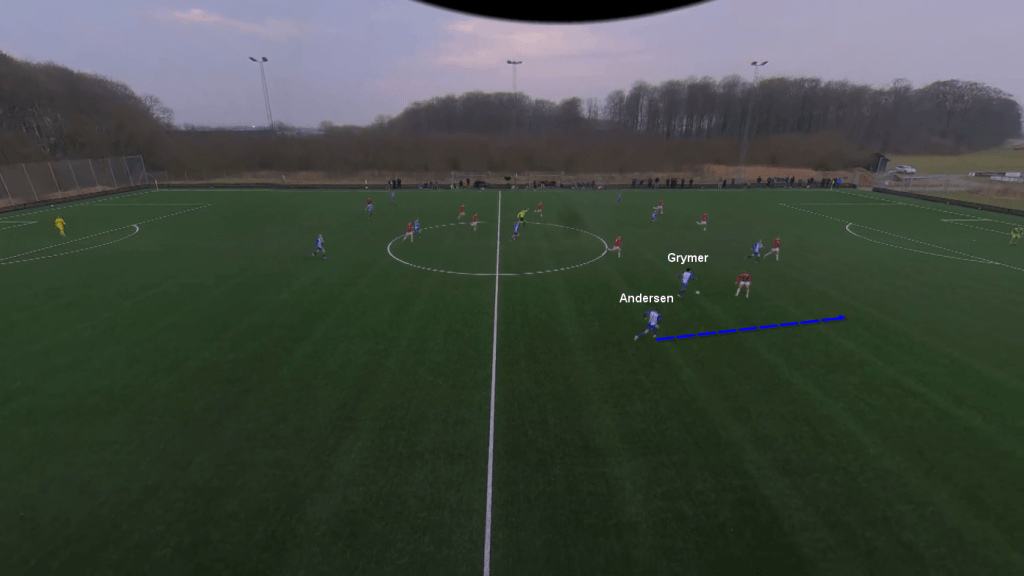 They also created effective overloads (2v1) in the final third, especially on their right flank with their right winger Grymer and their overlapping right full-back Magnus Andersen against the opposition left-back (see image below).