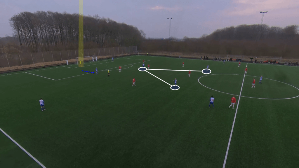 Vejle, coached by Mads Nissen in a 1-4-3-3 formation, used their left central midfielder Lykkebak to occupy the space between the opposition back four and midfield and connect the play (as illustrated in the image below). Their left winger Pedersen was also often positioned in their left half-space when building up by creating an overload against the opposition midfield three (4v3).