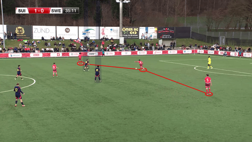 Interesting approach used in possession by Switzerland, coached by Luigi Pisino in a 1-4-2-3-1 formation, which tried to exploit the space left by the Swedish high defensive line by playing long balls from their centre-backs or dropping midfielders to serve their forwards behind the opposition defensive line. Their two central midfielders dropped either on the side of the CBs or between them (as in the image below) to create numerical superiority against the opposition two strikers.