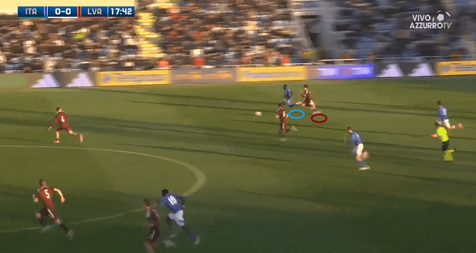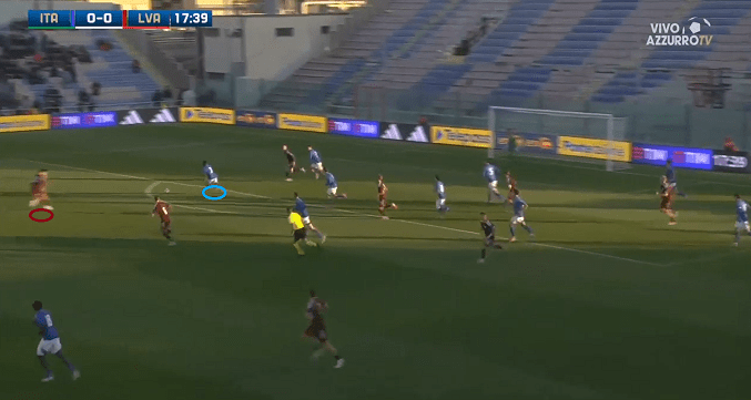 Italy, led by Alberto Bollini, started this encounter in 4-3-3 formation. A fairly confident, dominating and fluid game was played from their side and the significant individual qualities were also shown. The Italian players found themselves in quite easy positions in the sprint challenges as well as in the 1v1 situations (as we can see by the images below), and the corners were also for the team’s support – they had 14 in total (7 in each half of the game).