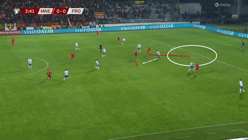 The Faroe Islands selection, coached by Eyðun Klakstein in a 1-5-4-1 formation out of possession, set up in a low defensive block and had their biggest chance in the first half with their stiker Knudsen receving the ball in the penalty box after a good sequence of passes and turning to shoot with the ball ending not too far from the goal post. In the second half, when Montenegro pressure increased they was pushed even further away from the opposition goal and had only few attempts to score on counterattack with Meinhard Olsen (Kolding IF new signing in the last transfer window and best performer on the pitch for the Faroese).