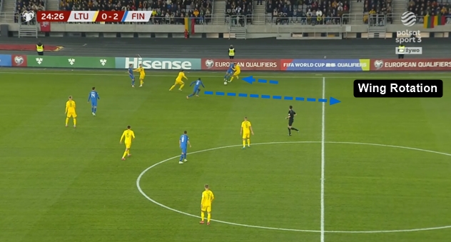 Other significant changes include wingers Daniel Håkans and Oliver Antman coming towards the ball and dragging the Lithuanian full-backs with them, creating space between the Lithuanian full- back and centre back for teammates to run into, receiving the ball and making dangerous inroads towards goal. Runs from midfield into these spaces and to the wing were made by midfielder Robin Lod, who could play as a wide midfielder, and Glen Kamara, the Stade Rennais midfielder on loan at Al-Shabab, who found himself more suited to these medium to long distance runs on and off the ball compared to the positional-oriented play under previous manager “Rive” Markkus Kanerva. Defensively, the outside midfielders also moved out wide to close down opponents in the half space or on the wing.