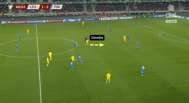 Gineitis scored a 25-metre goal to level the game. Playing as a left-footed attacking midfielder, he had the license to roam the field and create advantages. As the Finnish midfield chain of Rod, Kairinen and Kamara was stretched and outnumbered at times, he recognised and exploited the space outside and behind the Finnish midfield unit. He sometimes dropped into the 6 position to create a numerical overload against the Finnish front 3. He also made runs behind the Finnish defence to receive diagonal long passes, but they were less successful. Defensively, he participated in the Lithuanian press and block defending, however, he only recorded 1 interception. At 191cm, he could lay a few tackles to stamp his authority on the match.