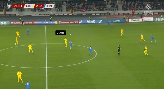Lithuania played in a 4-1-4-1 without possession. It was typified by energetic and coordinated pressing in goal-kicks and defensive transition, and block defending with marking, jumping on Finnish midfielders receiving the ball in front of the block, and having 9 players in a small playing area protecting central spaces and forcing the ball wide. NK Maribor right back Pijus Širvys recorded 16 defensive actions, while Utkus stopped Finnish attacks and counterattacks in midfield.