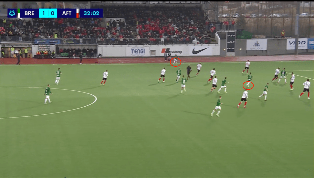 The second goal of the match perfectly encapsulated Breiðablik’s attacking structure. In the 32nd minute, Viktor Einarsson pulled out wide to the left flank during the buildup, providing width and isolating the opposition fullback. At the same time, Óli Valur Ómarsson intelligently drifted into a attacking midfield role.