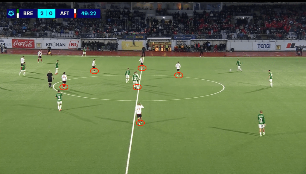 For much of the first half, Afturelding defended in a low and compact 4-3-3 block, aiming to stay narrow, protect the central zones, and absorb pressure. This setup limited space between the lines, forcing Breiðablik to work the ball wide or rely on quick positional rotations to create gaps.