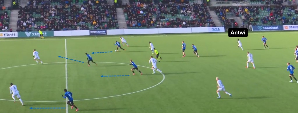 Another successful tactic by Inter was attacking down their right-hand side against KuPS’ attacking-minded left-back Clinton Antwi. With the man-marking pressing strategy and Antwi pushing high and drifting in field, this meant that Inter had 3 or 4 players ready to pounce on the counterattack and attack the space down the right (see image below). These counterattacks and numerical overloads resulted in golden opportunities but Inter did not score. In possession, right winger Antoin Essomba attacked the KuPS left-back in behind, while other Inter Turku ran into the right channel if Essomba was tightly marked.