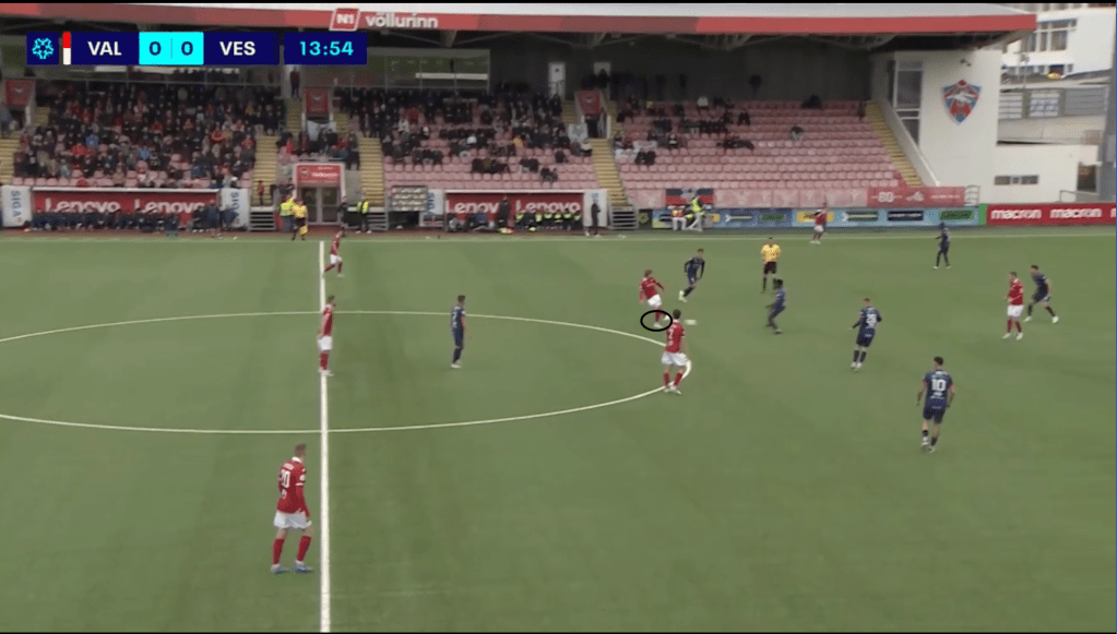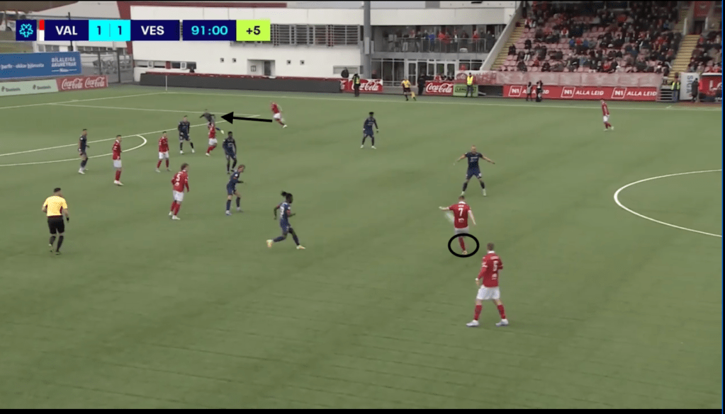 A standout aspect of Valur’s attacking strategy involved Jónatan Ingi Jónsson making constant diagonal runs in behind from the right wing. Time and again, Tomas Magnusson, Birkir Heimisson, and Aron Jóhansson attempted to pick him out with clipped or lofted balls into space. Though not always successful, this direct approach stretched Vestri’s back five and created space centrally.