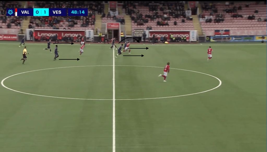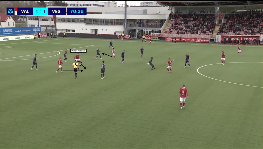 One of Valur’s most effective attacking patterns came through striker Patrick Pedersen. Known for his hold-up play, Pedersen frequently dropped between the lines to receive the ball. In a crucial sequence, he laid the ball off to Tryggvi Hrafn Haraldsson, who then released Kristinn Freyr Sigurdsson making a third-man run in behind — a coordinated move Valur used consistently to break the compact Vestri block.