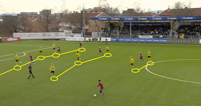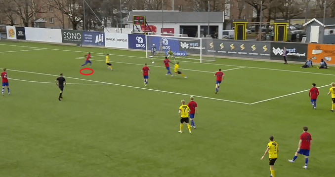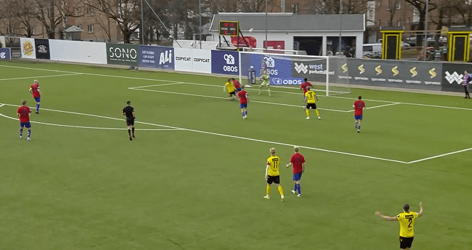 Skeid Fotball, led by its young and talented coach Vilde Rislaa, started this encounter in a formation of 4-4-2; the team demonstrated good level of resilience at the physical challenges, mainly around the midfield zone. Sulayman Bojang (right-back) stood out, as he was able to speed up the play, in addition to perform several important tackles and blocks in the defense (as we can see by the images below).