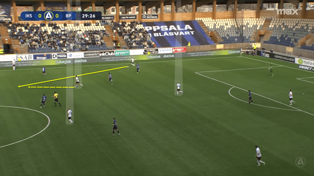 IF Brommapojkarna, coached by Ulf Kristiansson (who was recently promoted to the first team from their productive Academy), found good spaces to progress with the ball through the thirds by picking up intermediate positions with their midfielders, especially with Ackermann who supported in front of the ball to ‘break through’ the opposition midfield line (as in the image below).