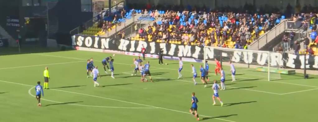 HJK defense had trouble in the aerial duels. In the following situation, while defending a cross, the Inter Turku player jumped higher than the HJK defender.
