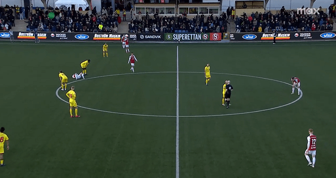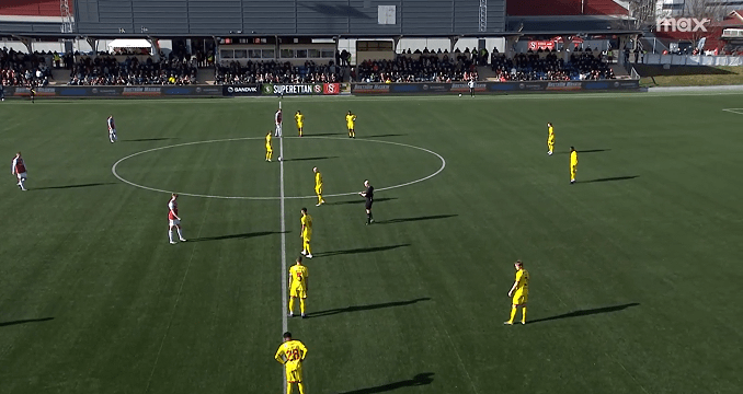 Sandvikens IF, under its coach Eldar Abdulic, started the game in 3-5-2 formation, but other different shapes and systems were also visible through the ninety minutes; as the pressure was elevated from the opposition side, the basic formation in the second part of the game involved a 4-defender line, to repel the offensive play of Kalmar FF, with higher efficiency. In the first half of the encounter, significant focus was put on to ball possession play; midfielder Daniel Söderberg often moved back to depths, to make connection between the defensive line and the midfield.