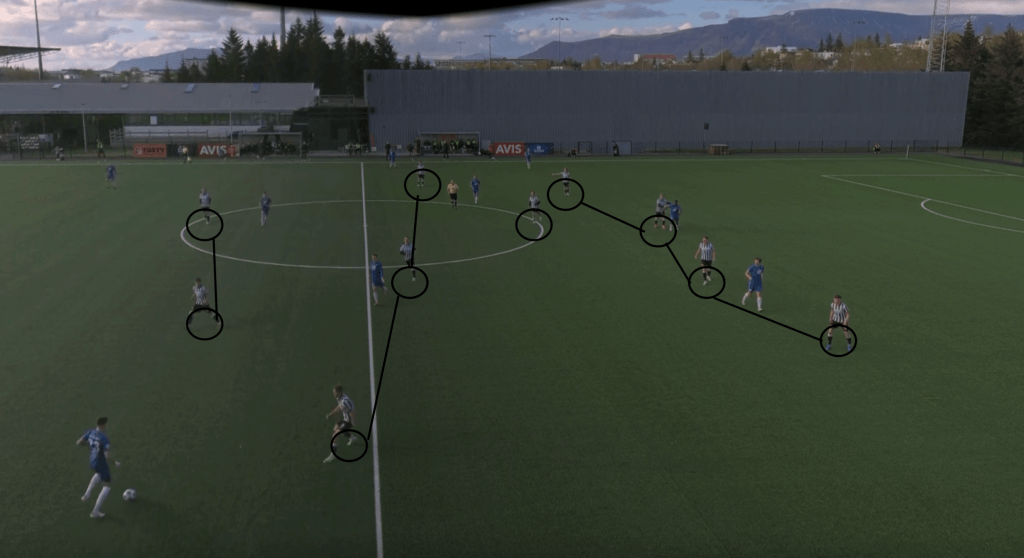 KR began in a 4-1-3-2 defensively, looking to press high and force ÍBV into wide areas. Their holding midfielder anchored the shape, but would often step higher into midfield, morphing their block into a temporary 4-3-3. This tactical flexibility disrupted ÍBV’s build-up and created pressing traps in central zones. Notably, KR’s full-backs stayed very narrow off the ball, reinforcing central compactness a trait ÍBV would later exploit with long diagonals into the space behind.