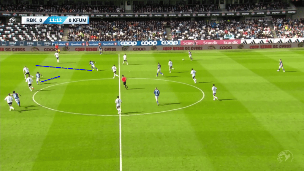 KFUM, coached by Johannes Moesgaard in a 1-3-4-3 formation, adopted well-timed opposite movements in their front three to drag the opposition back four out of shape with their right winger Hickson often attacking the back space from an inside position when the ball was out wide and their striker Okeke showing to receive the ball into feet (as by image below).