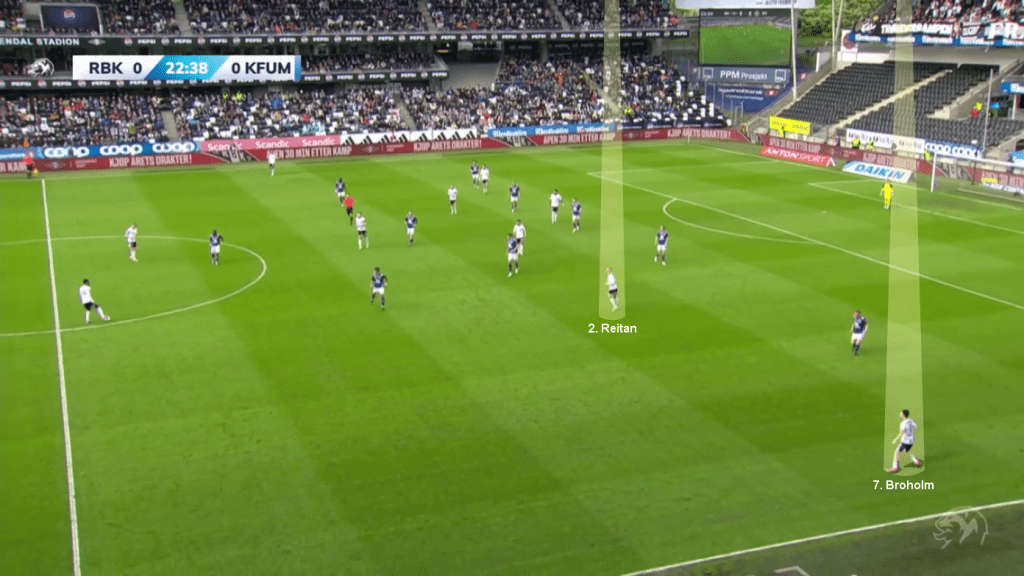 Rosenborg, coached by Alfred Johansson (ex FC Copenhagen U19 Manager) in a 1-4-3-3 formation showed good control on the ball with their midfield trio dictating the tempo of the match. In possession, their full-backs moved often into the half-spaces to create space for the wingers to receive out wide (as in the first image below) or to run into the back space from a more central position (as in the second image below).