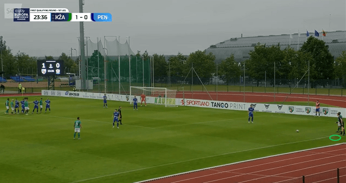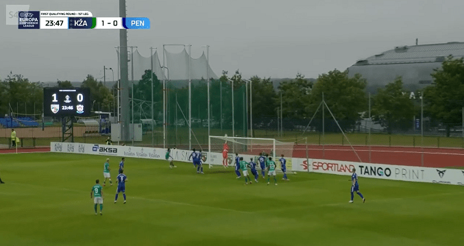 Penybont F.C., coached by Rhys Griffiths, started the match in 3-5-2 shape, which in the middle of the second half had to be changed for a 4-defender back line, after being down to 10 men. Welsh U21 young goalkeeper Luke Armstrong (2006 born, currently plays on loan from Cardiff City F.C.) was the one standing on the line, and performed several important saves and blocks – including a great shot stop in a 1vGK situation against opposition attacker Jansonas. Physically strong Gabe Kircough came up as leader of defense, by his good performance not only for his defensive work. Penybont showed strength in the physical challenges – they definitely will make it difficult for the opponents in the second leg in a week.