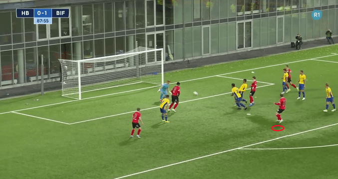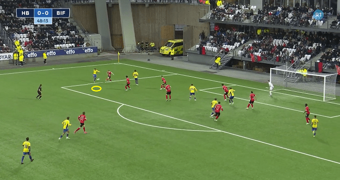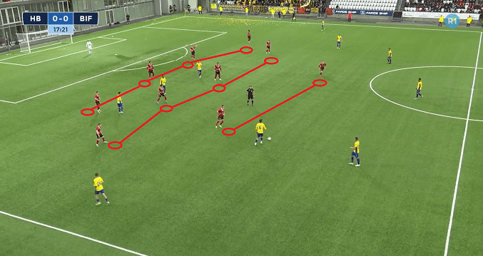 HB Tórshavn, under the guidance of coach André Olsen, started the game in 4-4-2 formation, with two players in the Target man role. All the players were tactically disciplined and their main focus was on to hold the shape (also off the ball / as you can see by the image below). In the first half, they were more or less able to make difficulties for the opposition defenders at their back line, but mainly they were waiting for the right opportunities to attack the Brøndby defense. In the second part of the game, the long throw-ins of Bartal Wardum (who played as right centre-back) turned to be dangerous and promising (from both sides). Being one goal down, the team could increase the offensive intensity one level higher – which definitely meant to be key factor in the late equalizing goal. HB Tórshavn’s likeable team character is essential to be highlighted.
