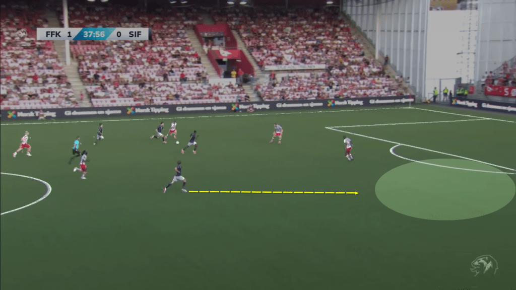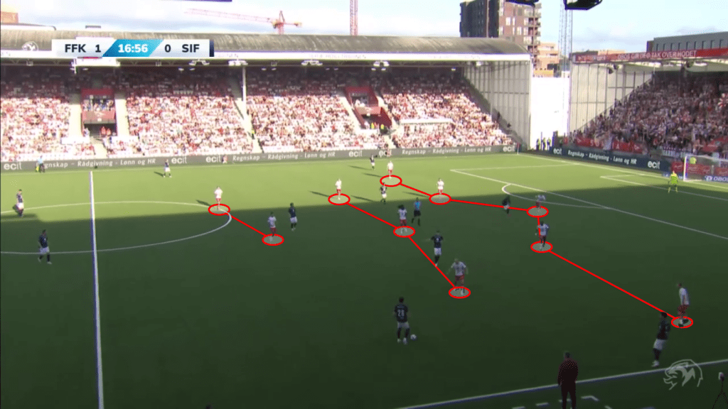 Fredrikstad reestablished the lead (3-2) with an outstanding positional attack from their right side, once again using the half-space to progress and a precise ‘cut-back’ from Øhlenschlæger (ex Vendsyssel) to Holten (ex Esbjerg) who finished with precision in the far post by using two touches (see image below).