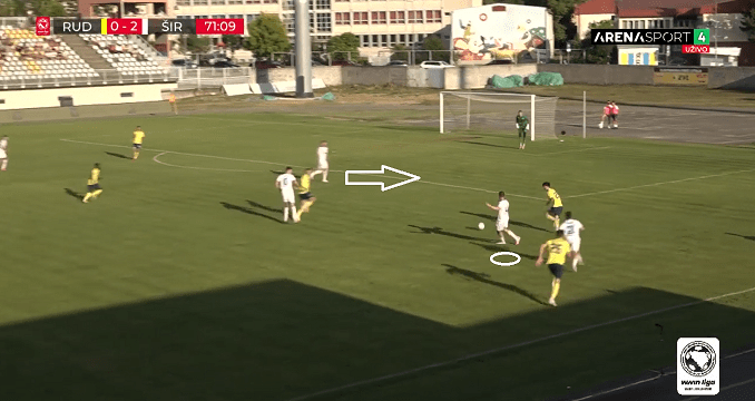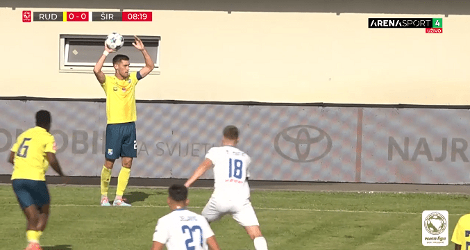 FK Rudar Prijedor (in yellow shirt), led by Serbian coach Perica Ognjenović (who is known for managing Serbia’s U18 national team earlier), started the game in 4-2-3-1 formation, with the tall and strong Croatian-Austrian striker Max Galić up front. They put a lot of emphasis on physical challenges, as they knew that the opposition team can build up its offense quickly – mainly by short passes. The defensive midfielder duo, Cameroonian Donald Molls and Ghanaian Joseph Amoah (both born 1998) definitely should be highlighted for their versatility and high work rate, in addition for offering stability and making great connection between the defense and midfield.