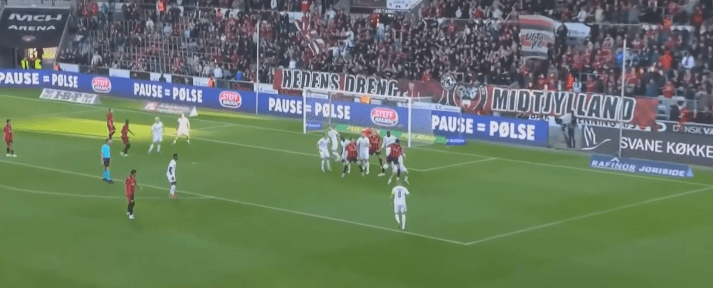 Throw-ins were always a distinctive feature with this moneyball-associated Midtjylland team. Here, right back Mbabu threw a low ball into CB Erlić, displaying yet another dangerous variation of attacking throws into the box – a layoff to a player, and if the ball was thrown higher and he won the first header, it was a 3v2 at the back (see image below).