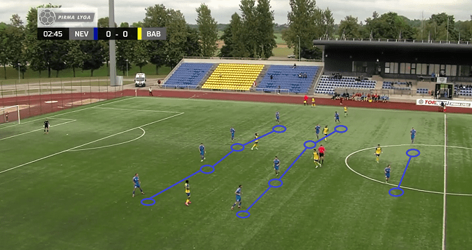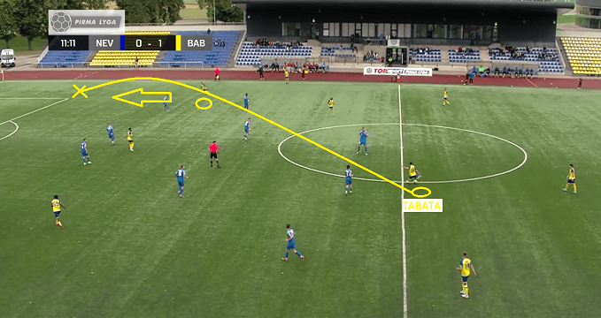 FK Babrungas on the opposition side (whose home league match against FK Minija we covered here), under the guidance of Plungė born coach Kęstutis Petkus, has started in a 4-3-3 reminiscent formation. Karolis Mantinis (who played as Number 6), often joined the back-line, to start to build up the play from there; Japanese central midfielder Shogo Tabata, made several brilliant and useful long-range passes, mainly to the flanks, to back the offensive wing-play (as you can see below). Brazilian players Renan Martimiano (STR) and Pedro Bahia (RW) understood each other well through the offensive play; the full-backs/wing-backs (Lukas Čepkauskas as right-back and Marius Skirmantas as left-back) supported the attacks with some progressive runs & passes. It was delighting to see Babrungas in offense, due to the players’ liveliness and good level dynamism.