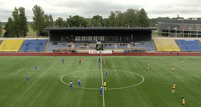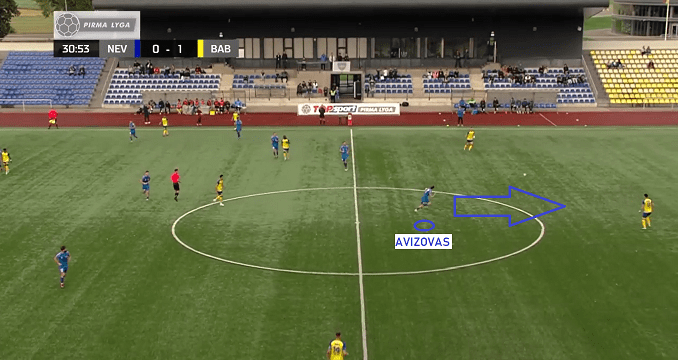 FK Nevėžis, led by its Latvian coach Dmitrijs Kalašņikovs, started the game in a 4-5-1 reminiscent shape, with two wide midfielders (Dutch-Surinamese Myles Veldman on the left side and local born Vakaris Skibiniauskas on the right); the defensive / off-ball system turned to be 4-4-2, with the Yevgeniy Mogil – Ugnius Avizovas duo up front (as you can see by the images below). Both Mogil and Avizovas played key roles in the team’s tactics: the Ukrainian striker Mogil had to participate in important aerial situations in the midfield zone and in/near the final third; the Lithuanian U19 national player Avizovas, with his excellent mobility and versatility, has offered quality support for his teammates in every crucial areas of the pitch, hand in hand with shaping the game by his great playmaking abilities. Goalkeeper Emilis Urbonas also can be highlighted, by demonstrating good potential and also a good goalkeeping performance.
