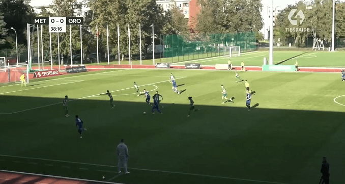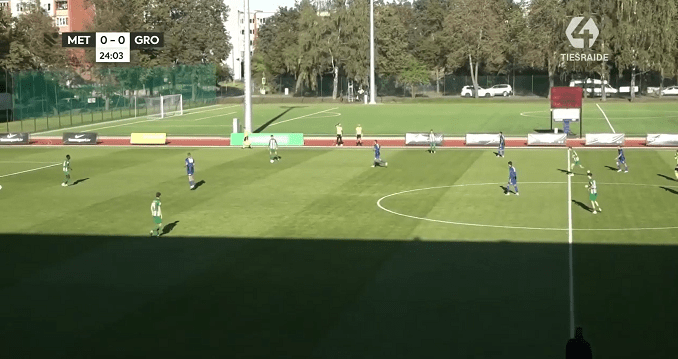 FK Metta, led by its coach Andris Riherts, started the match in 5-4-1 formation. Their wide midfielders, young (Latvian U21 international player) Markuss Ivulāns (as right midfielder) and Kristofers Rēķis (who started as left midfielder, but was also visible on the right flank and as “Number 10”) definitely elevated the offensive play by their creativity and liveliness. Despite of some minor difficulties in the defensive zone, under opposition pressure, the defense has solved the complicated situations more or less well. In the second half, left centre-back Ivo Minkevičs came up as the leader of the defense, and it was delighting to see that all five of the substitution players who went onto the pitch, gave some boost for the team.