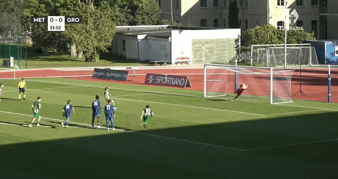 In the game’s 34th minute, FK Metta had big opportunity to take the lead by penalty kick, but it was saved by the opposition team’s goalkeeper Frenks Orols (as you can see below). Five minutes later (39th minute) FK Grobiņa‘s striker Mykola Agapov scored a goal by tap-in (which was assisted by a great right-footed cross of Maksims Sidorovs), setting the final result of the match (0-1).