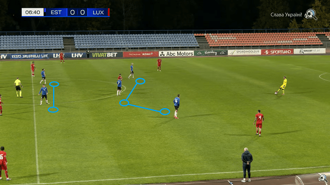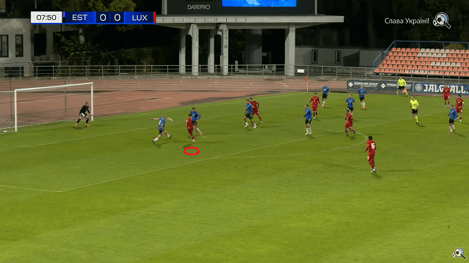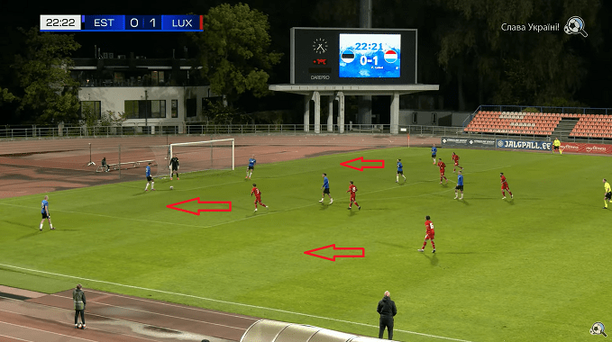 Luxembourg, under its coach Mario Mutsch, opted for a 4-2-3-1 reminiscent shape at the start, which often looked like 4-3-3. They started the game with a tricky move by the kick-off — the ball was sent for opposition throw, and thereby they could start the increased intensity pressing on the Estonian team immediately. Their very high level pressing play was typical through the entire match, often with a 4 or 5 man line. The team has demonstrated its special ability, to regain the possession with immediate effect (even on the opposing half). In terms of ball possession, Luxembourg was strongly convincing. Team captain Miguel Gonçalves (player for FC 08 Homburg in Germany) came up with his great leadership abilities.